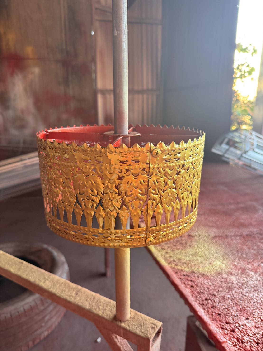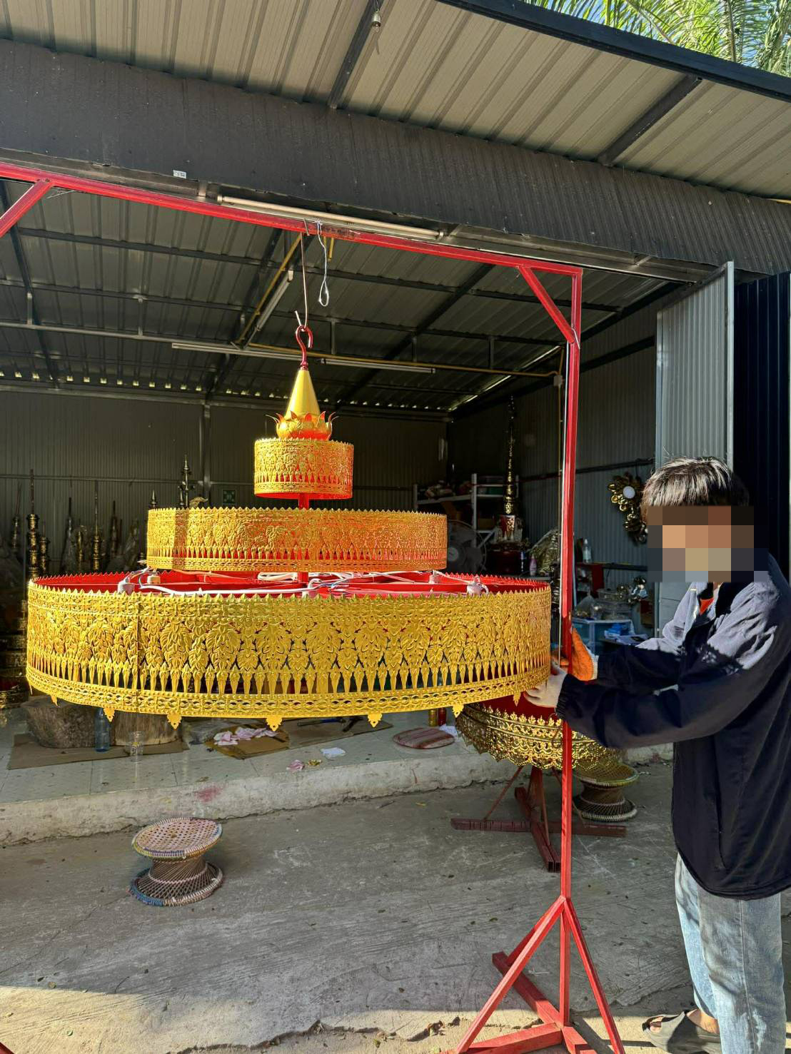 ฉัตรทองเหลืองฉลุสวยงาม 3 ชั้น พร้อมหลอดไฟ สำหรับแขวนบนเศียรพระ