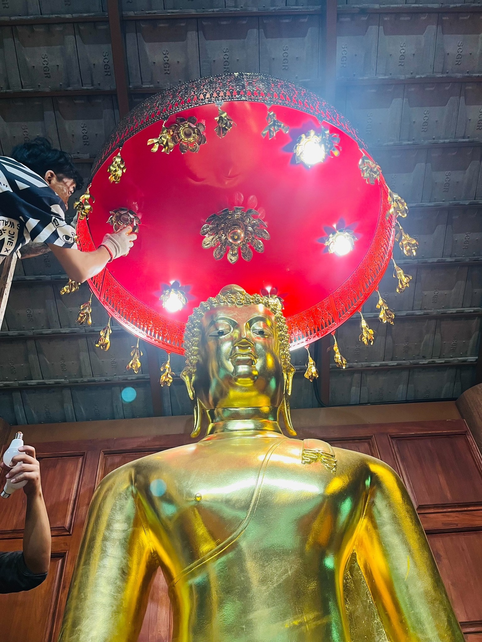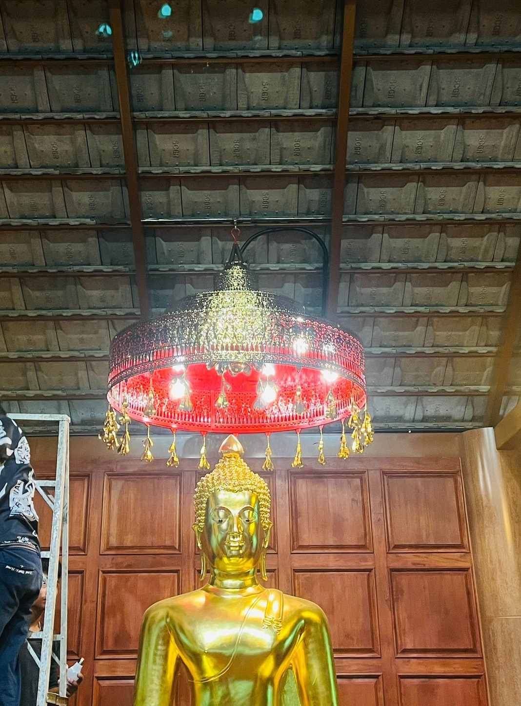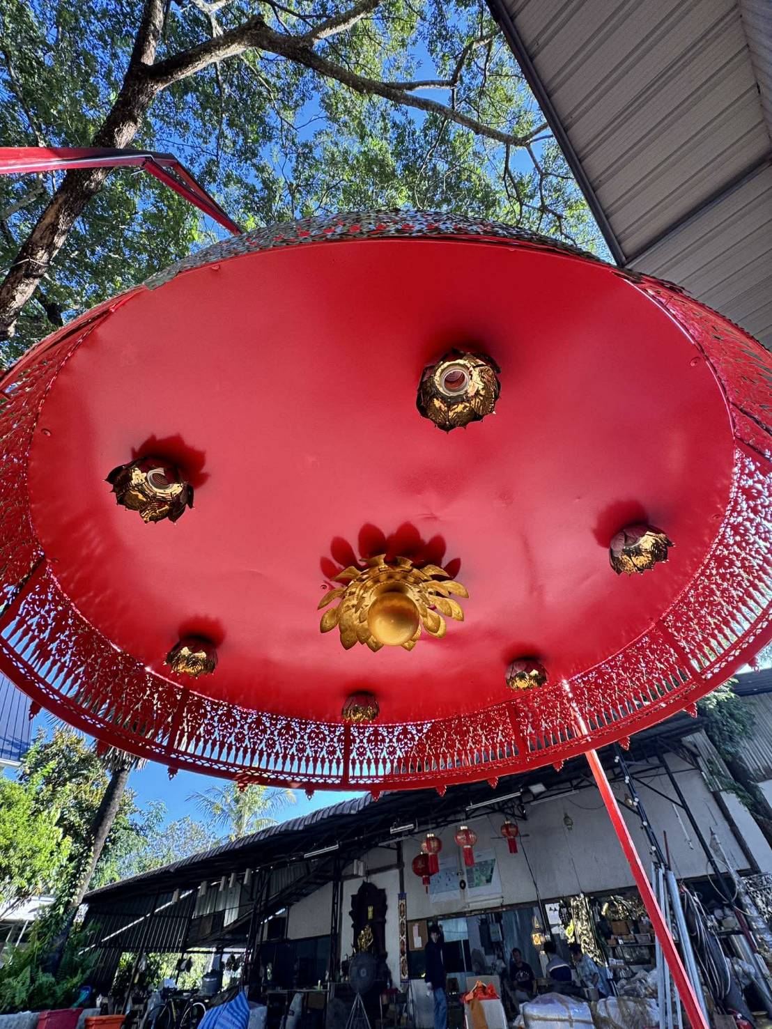 ฉัตรทองเหลืองฉลุสวยงาม 3 ชั้น พร้อมหลอดไฟ สำหรับแขวนบนเศียรพระ
